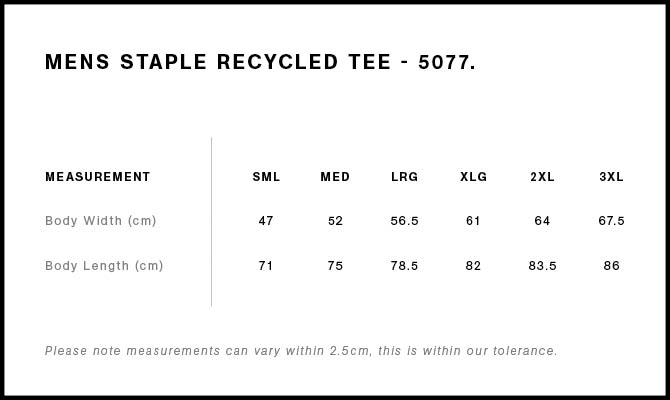• Fabric - Mid weight, 200 GSM, 28-singles, 80% recycled cotton 20% recycled polyester