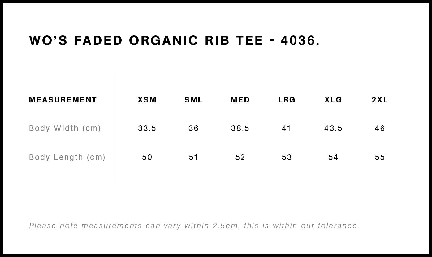 Introducing the Wo's Faded Organic Rib Tee in a slim fit. Crafted from heavy-weight 330 GSM fabric with 95% organic cotton and 5% elastane, it features wide binding and a double-needle hem. Preshrunk to minimise shrinkage.