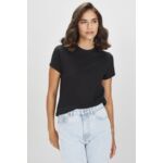 - Ribbed elastane neck opening for stretch and shape recovery